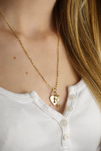 • Collier doré avec pendentif cadenas en forme de cœur et sa clé.